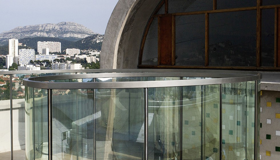 L’un des pavillons reprend l’ondulation d’une vague. Nous sommes bien à Marseille. Le dialogue entre Dan Graham, Le Corbusier et le spectateur prend forme. Sous forme de jeu. Un jeu surprenant de diffraction de la lumière, de pénétration environnementale… En fonction de la position du spectateur, de l’heure ou de la météo, la perception, les lois de la perspective ne cesse d’être troublée : un moment, la réflexion double de l’escalier conçu par Le Corbusier se découvre, un autre ; c’est la montagne qui se dédouble, et au milieu : soi-même. En toute liberté Dan Graham sollicite tous les sens du public, de la vue au toucher. Le sixième sens serait de se laisser porter, comme les sculptures entre ciel et terre.