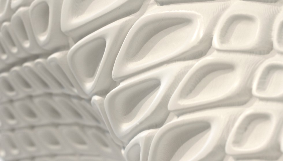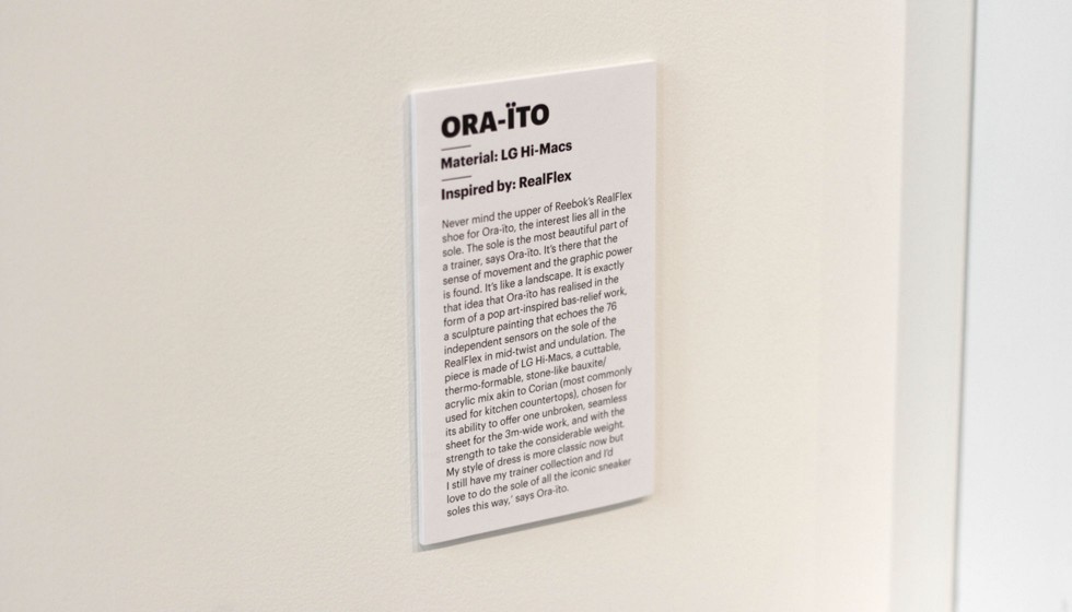 It’s there that the sense of movement and the graphic power is found. It’s like a landscape. It is exactly that idea that Ora-ïto has realised in the form of a pop art-inspired bas-relief work, a sculpture painting that echoes the 76 independent sensors on the sole of the RealFlex in mid-twist and undulation. The piece, which is produced by Candido Hermida, is made of Hi-Macs®, a cuttable, thermo-formable, stone-like bauxite/acrylic mix, chosen for its ability to offer one unbroken, seamless sheet for the 3m-wide work, and with the strength to take the considerable weight. My style of dress is more classic now but I still have my trainer collection and I’d love to do the sole of all the iconic sneaker soles this way,’ says Ora-ïto.