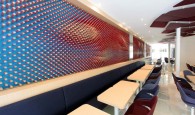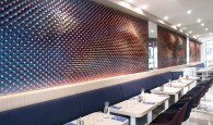 In a sensory decor, combining the wood’s warmth and the felted texture of Kvadrat fabrics, a unique creation inspired by kinetic art is shown on the wall, a sincere tribute to Vasarely: a wave of pixels entirely created in oak wood by Ora ïto, is this restaurant’s very first signature piece.