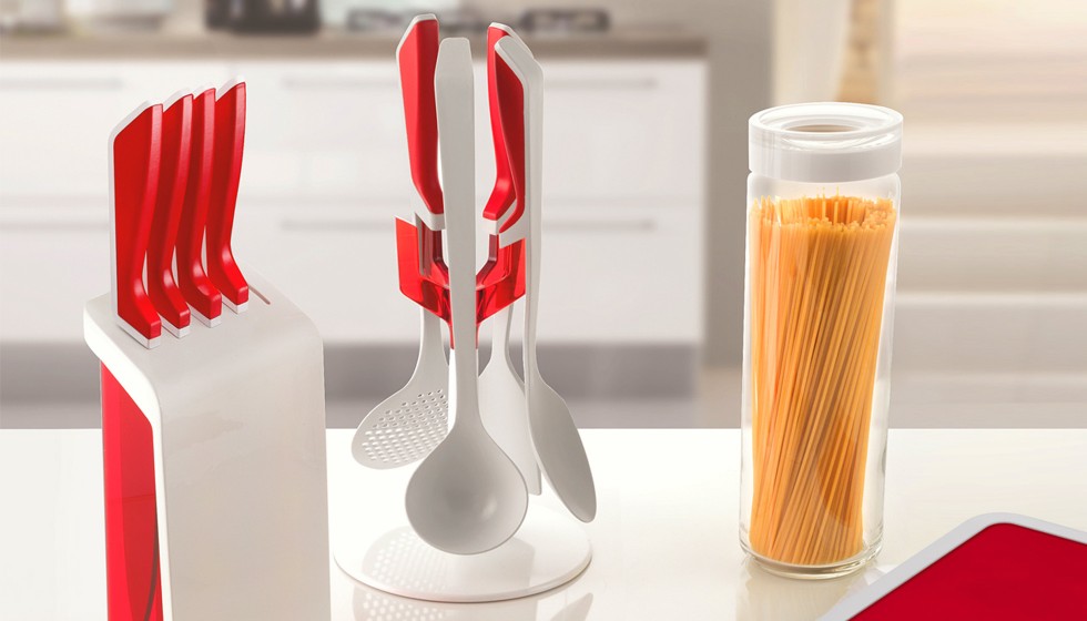 Les ustensiles sont appropriés à tous les types de casseroles tant en acier qu’avec le revêtement interne antiadhésif grâce à la matière plastique qui les compose, anti-rayures et résistante aux températures élevées. La large base de la structure garantit une très bonne stabilité et un système novateur d’accrochage des ustensiles à la base confère au produit une forme originale et vraiment novatrice.